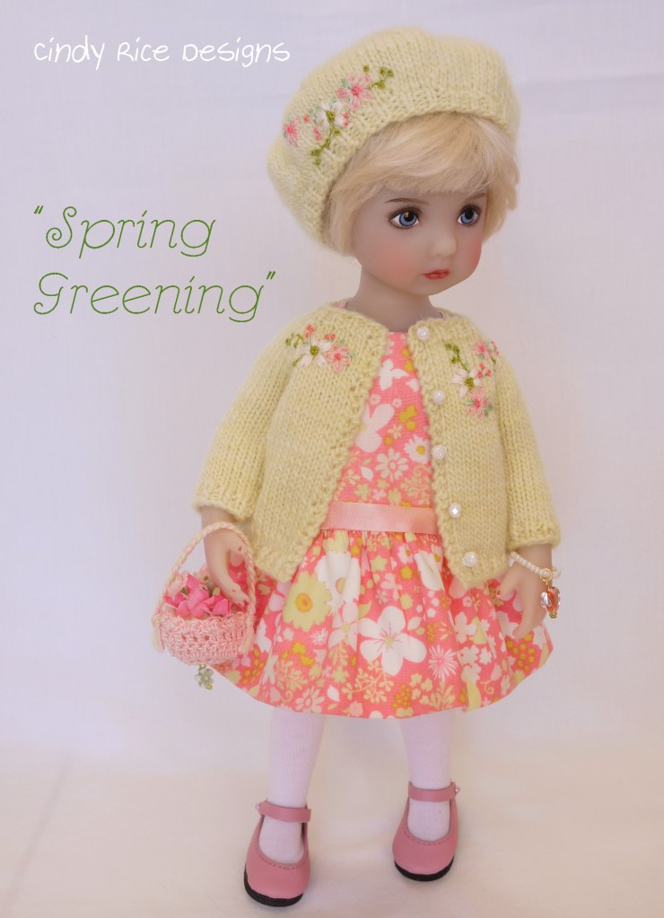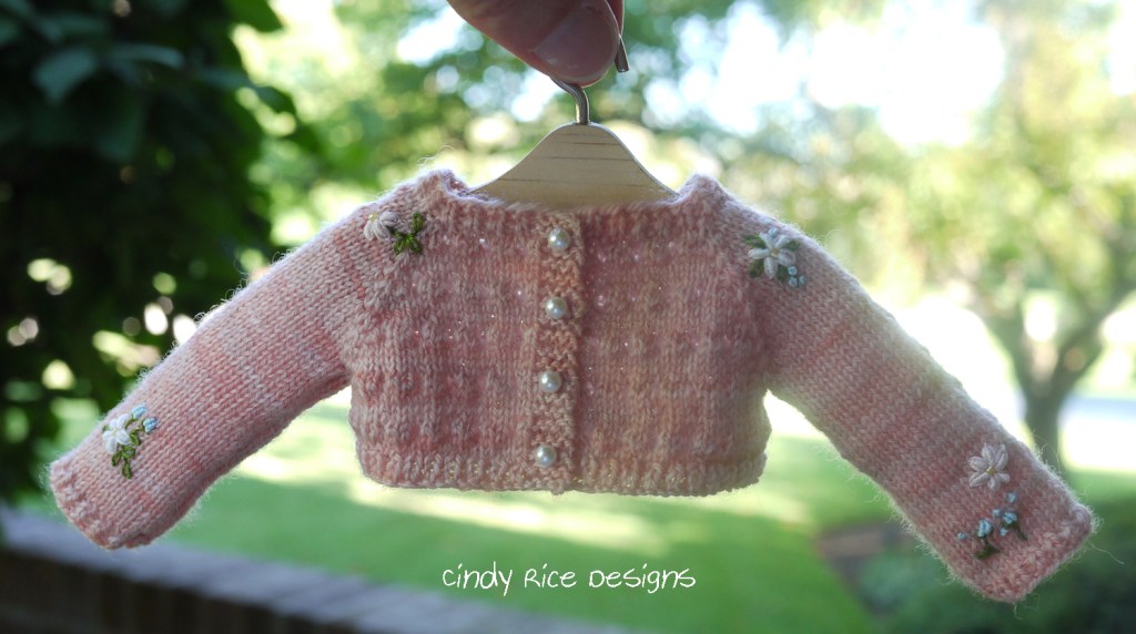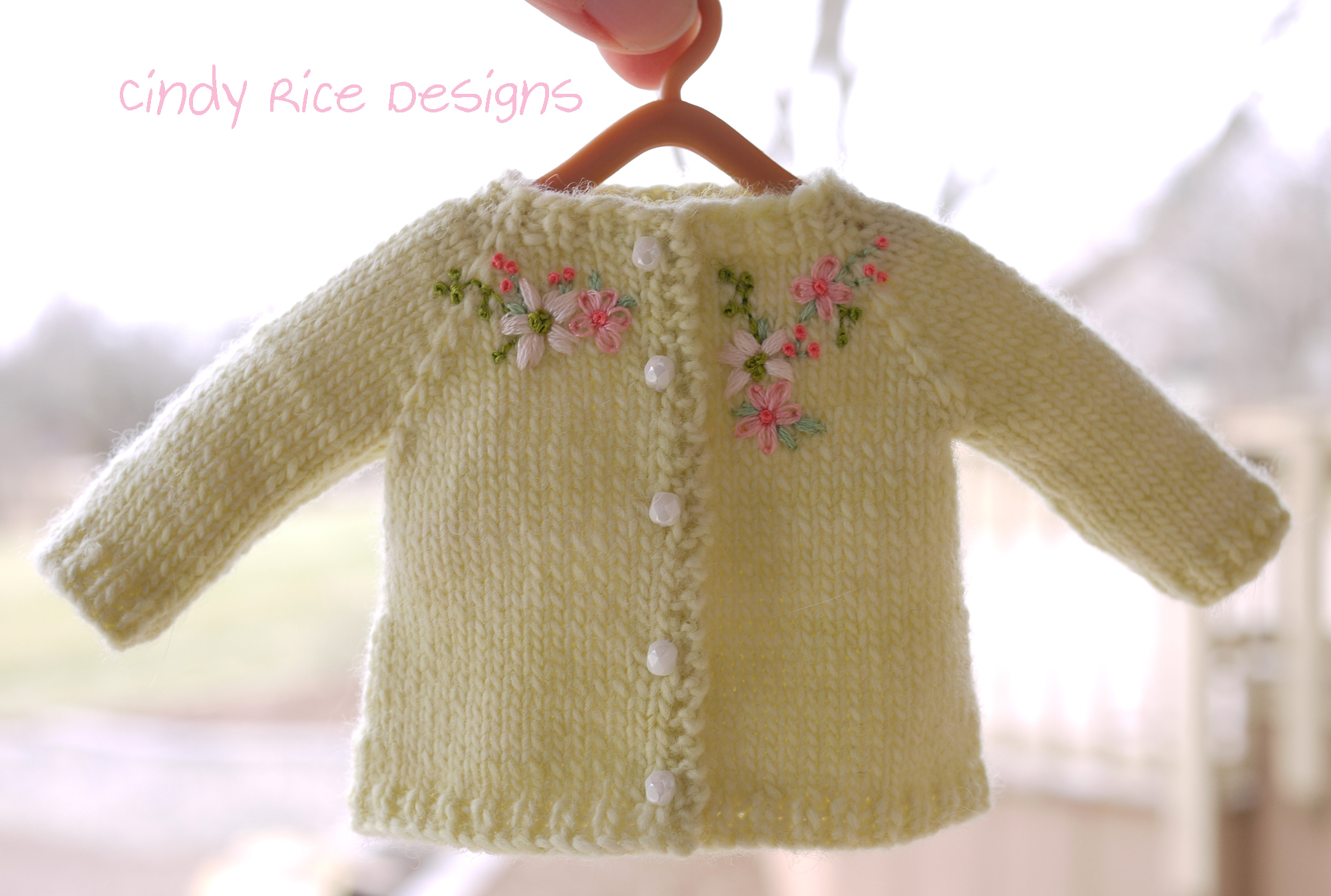 I dyed merino wool to get the palest shade of yellow green for Evianna’s knitwear. In the hank the yarn looked barely dyed, but when knit up it is definitely a beautiful yellow green and matches the dress florals beautifully. I made her sweater a bit longer to cover the bodice length and gave it a slight a-line shaping. After many hours of embroidering, and adding shimmery Czech glass bead buttons her sweater was complete.