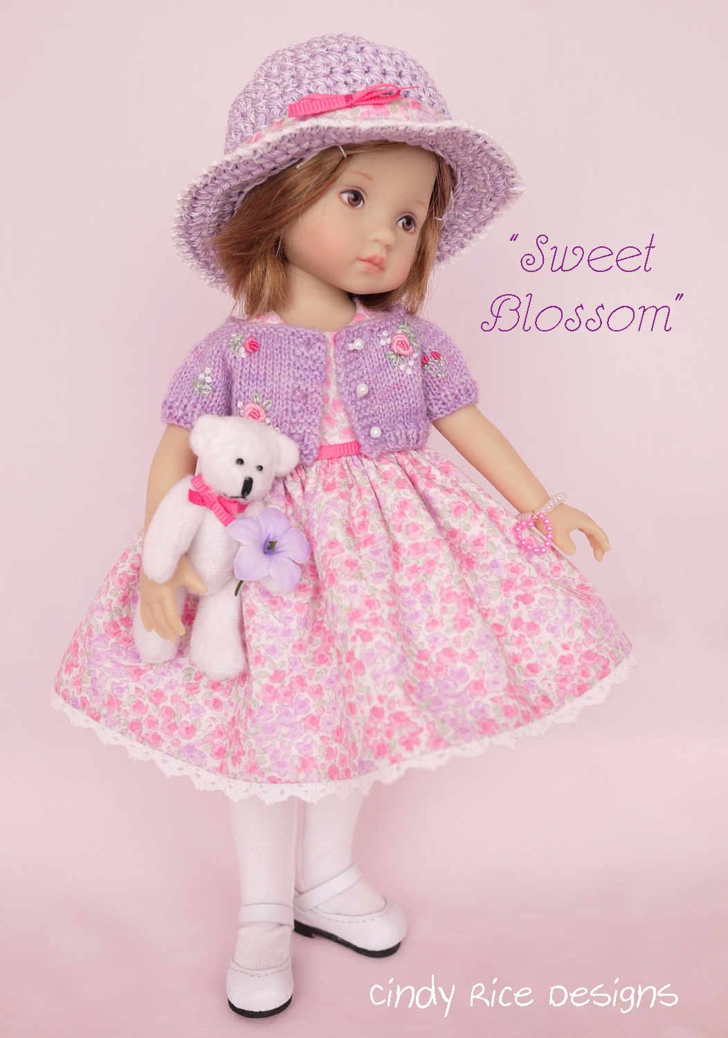 Rose loves her new springtime ensemble. I chose a beautiful pink/lilac tiny floral print for her dress. The full skirt is edged with white cotton lace; a bright pink grosgrain ribbon ties around the waist. Her hand knit cardigan is knit with a lilac tonal hand dyed merino yarn. It is embroidered with random rose/floral motifs in coordinating colors. Her spring hat is crocheted with cotton and bamboo threads. The hat band is made with matching dress fabric and ribbon. In my stash I found Rose a white teddy bear and embellished the foot pads with embroidery, made a matching bow, and gave Theodora a lilac colored blossom.