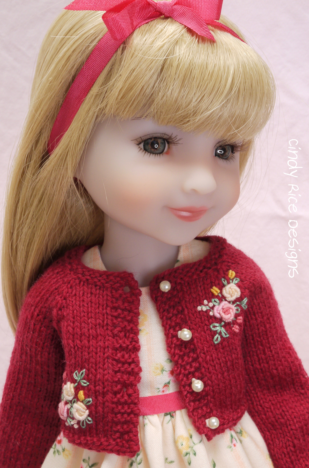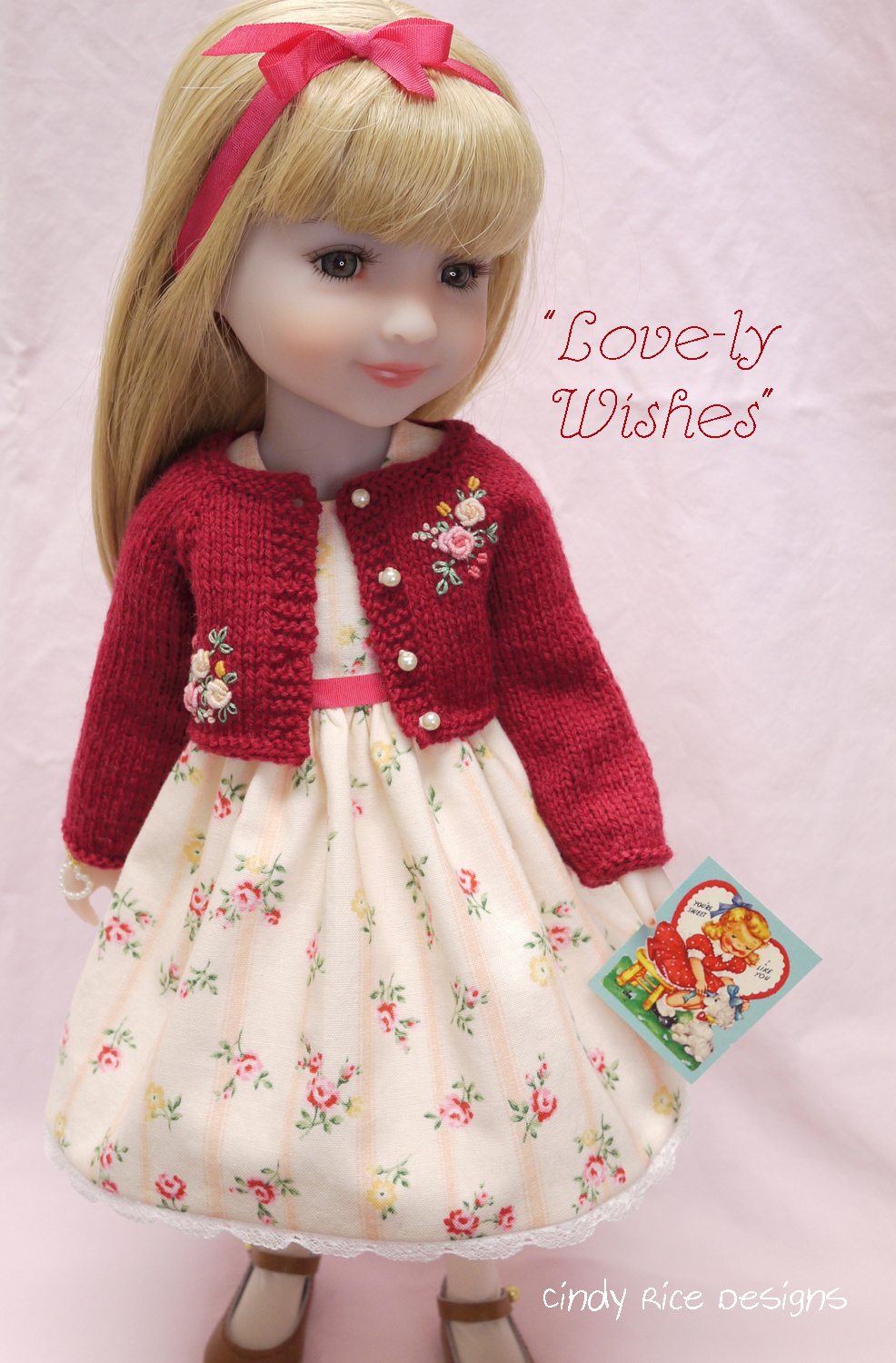 Holly is dressed and ready for Valentine’s Day 2022. Holly’s dress is made out of a peach striped cotton fabric which is sprinkled with red and yellow roses. Her red wool cardigan is keeping her cozy and warm and is embroidered in colors to coordinate with her dress.